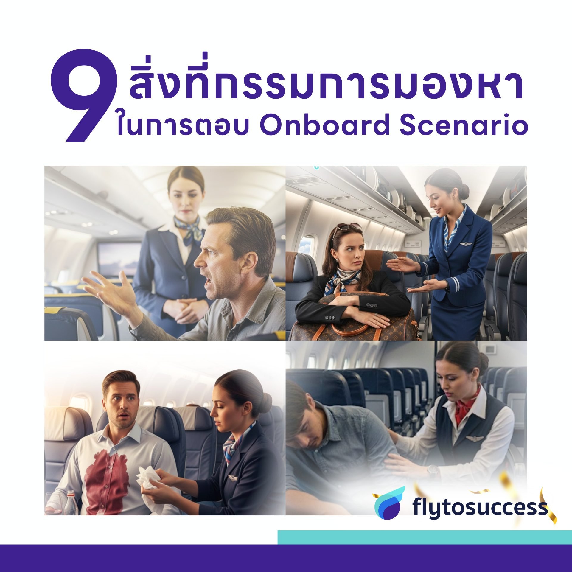 หากเจอกับสถานการณ์ เช่น ผู้โดยสารไม่เก็บกระเป๋า, ทะเลาะกัน, หมดสติ, อาหารหมด ฯลฯ สิ่งที่ลูกเรือควรทำมีดังนี้