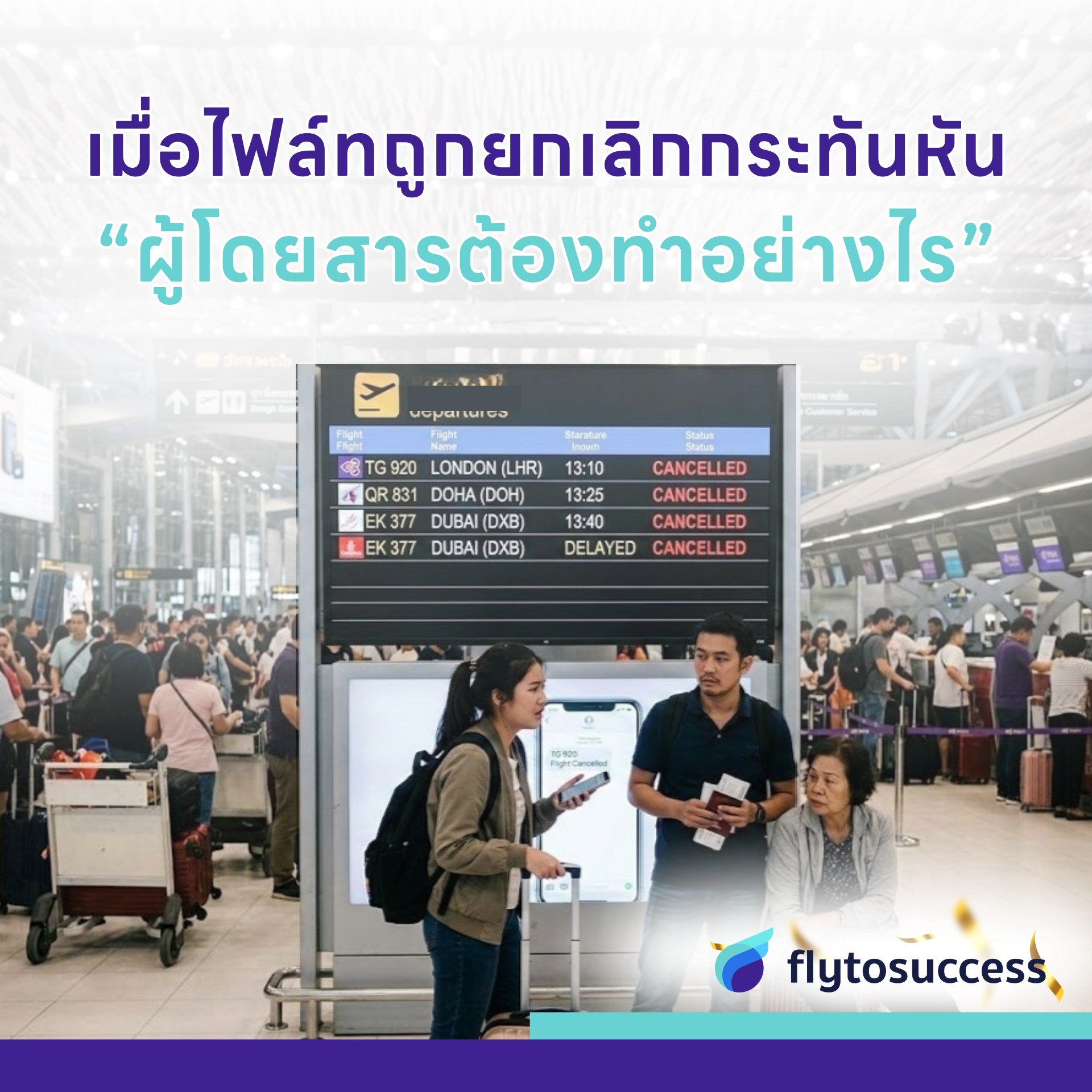 หากไฟลต์ถูกยกเลิกแล้ว รอคำแนะนำจากสายการบินก่อน เพื่อลดความเสียเวลาและความแออัด - ติดต่อสายการบินหรือเอเจนต์ทันที
